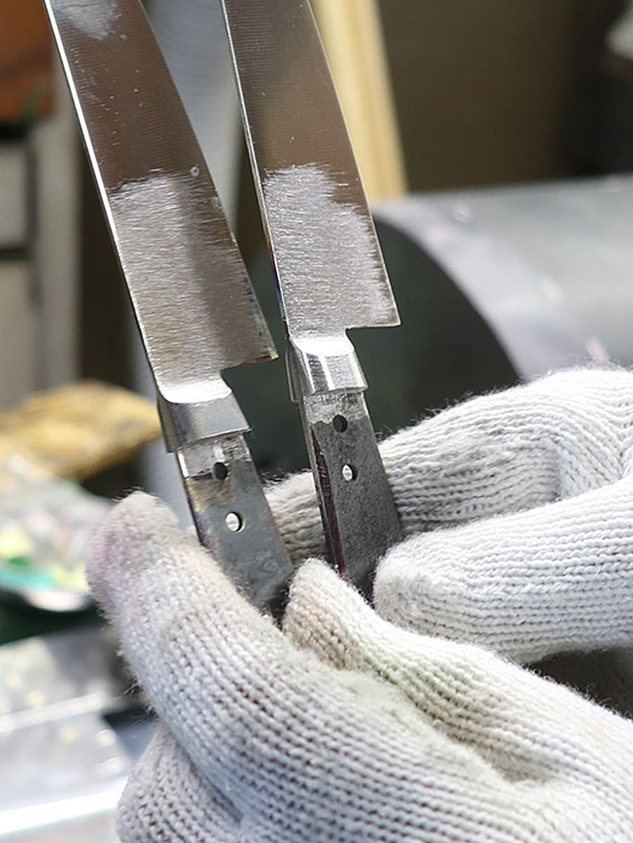 高温に熱した金属を型に入れプレス・成形された口金を、両側から包丁を挟み込むように溶接します。エーデルワイス包丁発売当初は不可能だったステンレス包丁への口金溶接は、長年の研究改良により可能となった工程です。