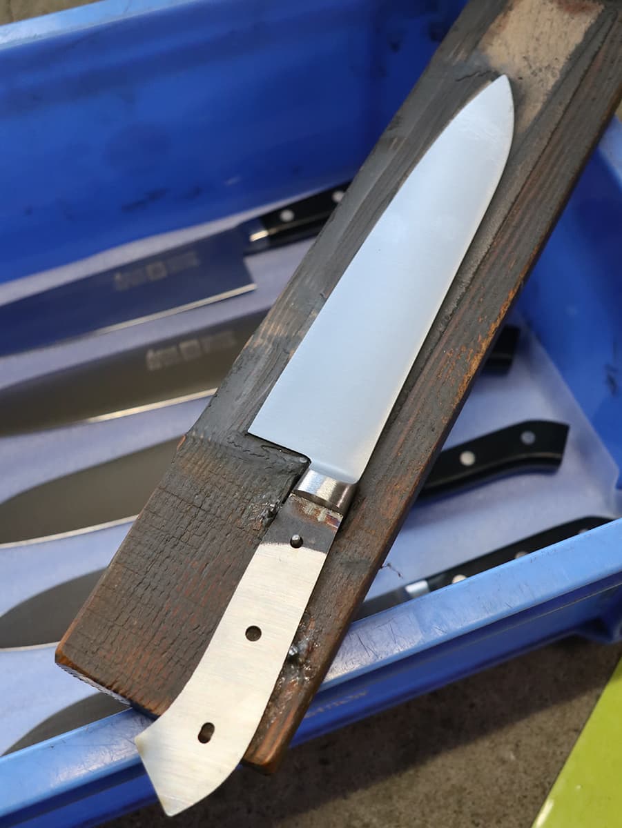 熱処理は、包丁の形に抜き取られた鋼材の硬度・強度・靱性・耐摩耗性を上げるための工程です。先ず1000℃を超える高温で加熱し金属組織を変態させ硬度・強度を上げます。続けてマイナス75℃で冷却(サブゼロ処理)することで、時を経て歪み・変形の原因となる残留組織の問題を解消。その後、150℃×2回の焼戻しで、靱性、耐摩耗性を持たせます。